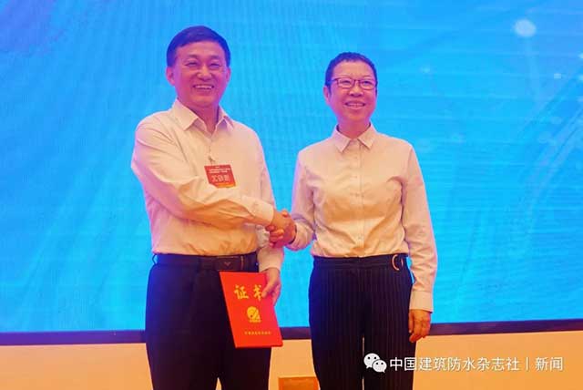 中國建筑防水協(xié)會(huì)常務(wù)駐會(huì)副會(huì)長苗燕向胡希寶頒發(fā)瓦屋面分會(huì)副秘書長證書。